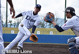 ウォーミングアップ前に投手・野手に分かれてミーティングが行われ、橋上コーチより「来年の一軍に絶対入るという気持ちで、全員競争意識を持ってやるように」と話がありました。