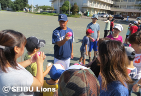 75名の親子が参加し、ライオンズアカデミーの平尾博嗣コーチ、星野智樹コーチから、野球の動作のコツを教わり、キャッチボールやティーバッティングを楽しみました。