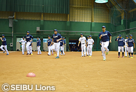 今朝未明から降り出した雨により、この日組まれていた広島東洋カープとの練習試合は明日に順延。チームは室内練習場での練習となりました。
