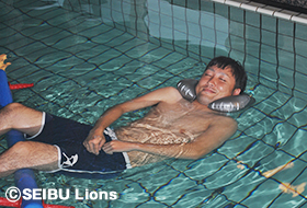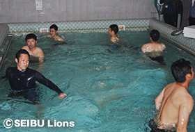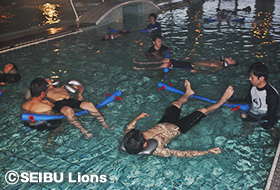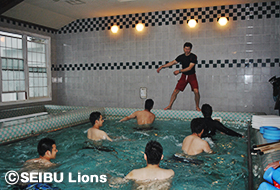 今回のトレーニングを担当した国際武道大学コンディショニング室長の山本利春氏は「海水の浮力を利用して軽い運動やストレッチを行って身体を緩めることにより血液の循環を良くし、疲労回復をスムーズに行うアクティブレストと呼ばれることをやっていっています。まだ取り入れている球団は少ないと思いますので、今回のことは非常に良いことだと思います。」とメニューの目的を説明。 その後は、さまざまな器具を用いながらストレッチやウォーキングを行っていきます。