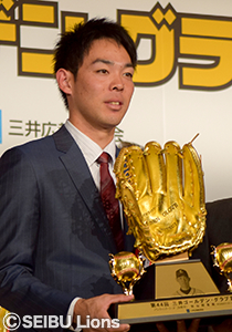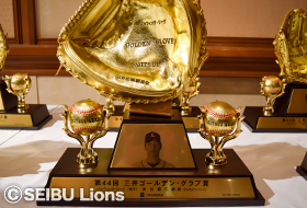 ライオンズからは炭谷 銀仁朗選手と秋山 翔吾選手が出席し、両選手が愛用しているグラブをかたどって制作された金色のグラブ型トロフィーが授与されました。 おめでとうございます!