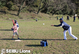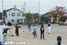 11月22日(日)所沢市立所沢中学校を会場に、「親子手打ち野球&ティーボール教室」を実施。所沢市内で活動する野球関係の団体が協力し、小学生以下のこどもを持つ親子を対象に、キャッチボール、ティーボール、三角ベースボールなどの野球遊びを楽しみました。今年はライオンズOBの2人が講師に加わり、「親子向けキャッチボール講座」も実施。初めてボールを握るこどもたちに、丁寧に基本から指導しました。