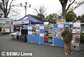駅前広場に地域活動ブースを設け、2015年シーズンにファンの皆さまにご参加、ご協力をいただいた「LIONS HAPPY MOTHER’S DAY」、「WFPウォーク・ザ・ワールド in 西武プリンスドーム」、「カンボジアのこどもたちに野球用具を寄付しよう!」の写真展示や、野球振興、幼稚園訪問など各プロジェクトの活動報告、フレンドリーシティの観光情報掲出を行いました。