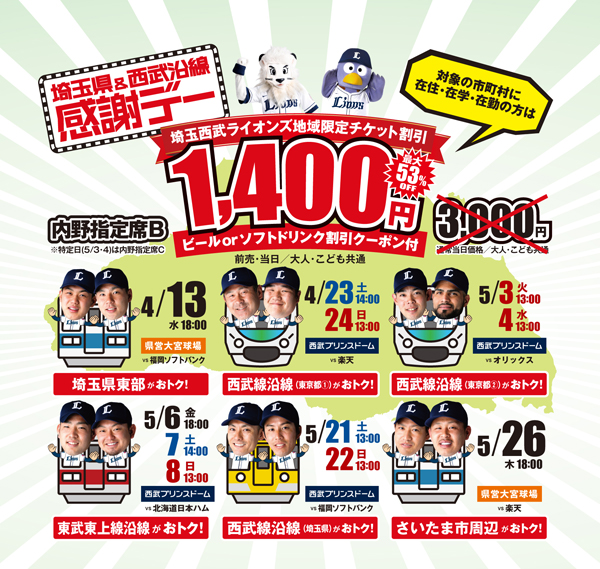 日頃より埼玉西武ライオンズを支えてくださっているファンの皆さま、地域の皆さまに感謝の気持ちを込めて、埼玉県の全市町村および西武沿線の市区町村「在住」・「在学」・「在勤」の皆さまを対象として、区市町村ごとに設定した試合の内野指定席を「感謝特別価格1,400円(最大53%オフ)」(※)にてご観戦いただけます!