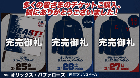 | 3月27日(日) | 13:00試合開始 | オリックス | オリジナルフリース「L×2016」バージョン |