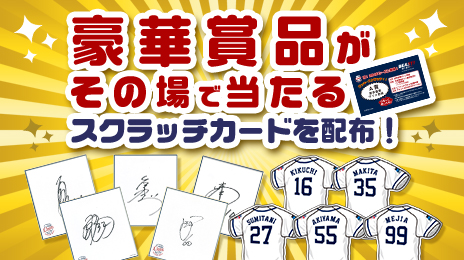 3月25日(金)~27日(日)開幕シリーズ3連戦は、来場者へのオリジナルグッズ配布(3月25日はスローガンフラッグ、3月26日&27日はオリジナルフリース)に加えて、「選手直筆サイン色紙」や「観戦チケット」などの豪華賞品がその場で当たる“スクラッチカード”も、配布いたします!