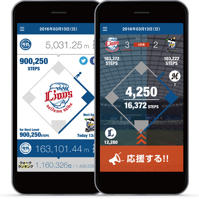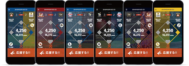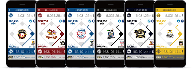 『パ・リーグ ウォーク』は、全てのスマートフォンに対応しており、ファンの方は一度アプリをダウンロードすれば、あとは自動的に歩数が計測される仕組みです。 まずは自分が応援する球団を選択します。日常的な利用では、「本日の歩数はダイヤモンド何周分です」と表示が出たり、応援する球団の選手が画像で「今日はたくさん歩いたね!」などと呼びかけてくれます。試合日の利用では、応援する球団ごとにファンの合計歩数を競ったり、合計歩数の順位を表示したりします。(*1)