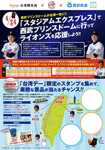 台湾デーを記念して、ドーム前広場でスタンプラリーを実施します(協力:西武鉄道)。西武球場前駅外、台湾観光PRブース、西武プリンスドーム内に設置されたスタンプを3つすべて揃えると抽選で台湾デーオリジナルタンブラーや、台湾お茶パックなどが当たります!