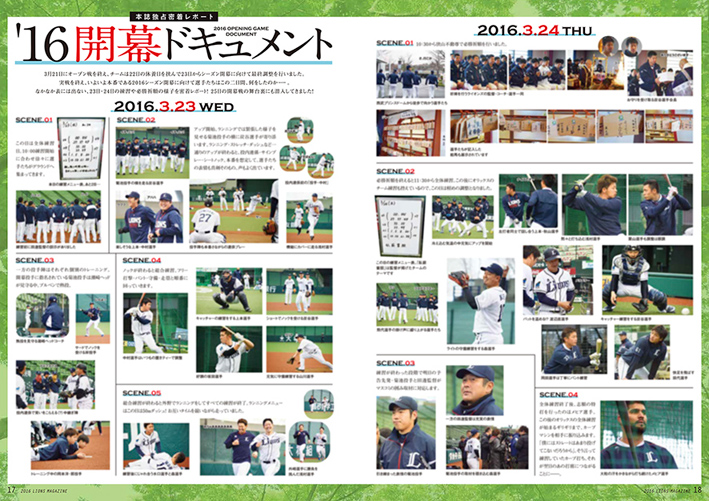 開幕密着ドキュメントでは、開幕を控えたライオンズの3日間に完全密着!開幕前の練習や必勝祈願、開幕当日の選手の食事メニューまで、選手たちが何を感じ、何をしたのかを徹底追跡。ほかでは見られない内容が満載です。