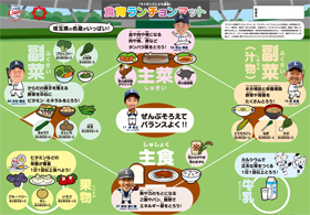 埼玉西武ライオンズは、埼玉県が進める「健康長寿埼玉プロジェクト」の一環である、「埼玉県食育推進計画」の指針に則り、食育(食事のバランスや、地産地消)について、選手やマスコットを通じてより身近に学んでもらいたいというコンセプトで、「食育ランチョンマット」を製作いたしました。