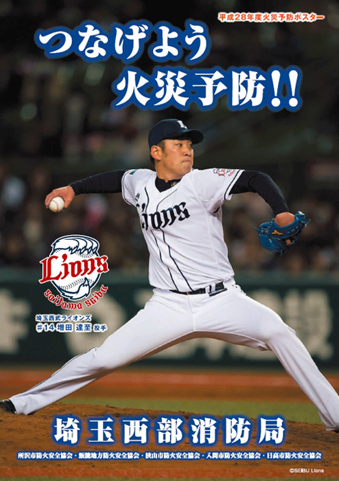 埼玉西部消防局が広報活動を実施する管内(所沢市、飯能市、狭山市、入間市、日高市)の各事業所や公共施設などに掲出する「つなげよう 火災予防!!」のスローガンポスターに増田達至投手が登場します。
