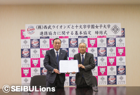 4月21日、株式会社西武ライオンズと十文字学園女子大学は、「連携協力に関する基本協定」を締結。同大学にて、締結式が行われました。