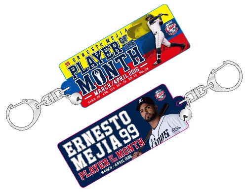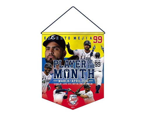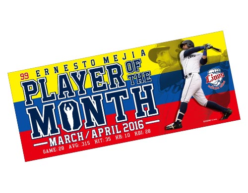 メヒア選手は3・4月度、チームの全28試合に出場し、打率(.315)、安打(35)、本塁打(10)、打点(28)の好成績を残しました。メヒア選手の豪快なバッティングフォームをデザインし、月間MVPを表す"Player of the month"の文字をデザインしたフェイスタオル、タペストリー、キーホルダーの3点セットです。