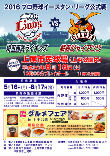 [前売券販売窓口] 上尾市民球場・(有)横田運動具店・ローソン北上尾店・リカー館スダ・上尾市観光協会・上尾市文化センター・イコス上尾・上尾市コミュニティーセンター・上尾市自然学習館・瓦葺ふれあい広場・上尾市役所1階売店 当日券
