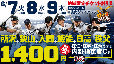 第1回目は6月7日(火)~9日(木)巨人戦にて、「所沢市・狭山市・入間市・飯能市・日高市・秩父市」の6市が対象。
