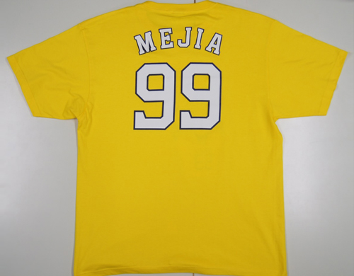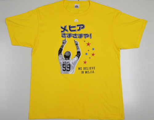 Tシャツは「メヒアさまさまや!」の文字と、メヒア選手がホームランを打った際に行う両手を高く突き上げるポーズのシルエットを表にプリントし、背中にはネーム&ナンバーを配したデザインになっています。