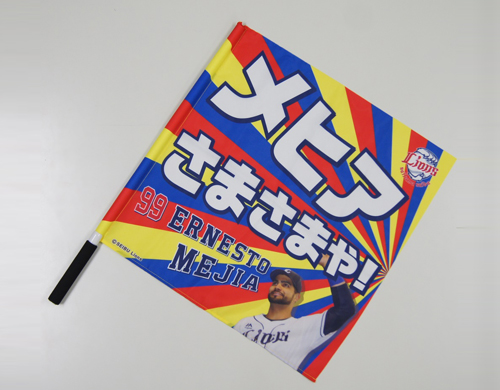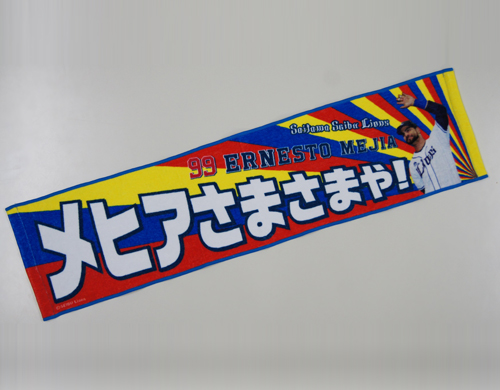 ショートマフラータオルとフラッグは球場ではお馴染みの青・赤・黄のメヒア選手タオルと同じカラーリングで「メヒアさまさまや!」の文字を大きくデザインしました。