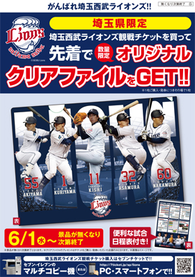 | 内容 | 埼玉県内のセブン-イレブンにてチケットを発券すると、その場でオリジナルクリアファイルをプレゼント!(先着) |