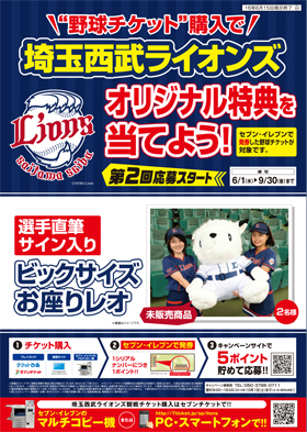 | 内容 | セブン-イレブンで観戦チケットを発券してシリアルナンバーを5つ貯めて応募すると「選手直筆サイン入りビッグサイズお座りレオ」が抽選で2名さまに当たる! |