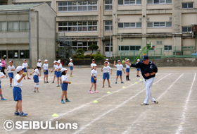5月は、小学校にライオンズアカデミー岡村隆則コーチ、高山久コーチが訪問。ベースボール型ゲームのティーボールを楽しむために必要な「投げること」「打つこと」に必要なコツを両コーチが伝えました。