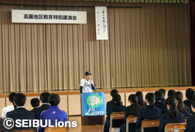 5月14日(土)日高市立高麗中学校にて「高麗地区教育特別講演会~夢の実現に向けて~」が開催されました。高麗中学校の全校生徒をはじめ、地域の皆さまも参加した本講演会に、講師としてライオンズアカデミー岡村隆則コーチが登壇。