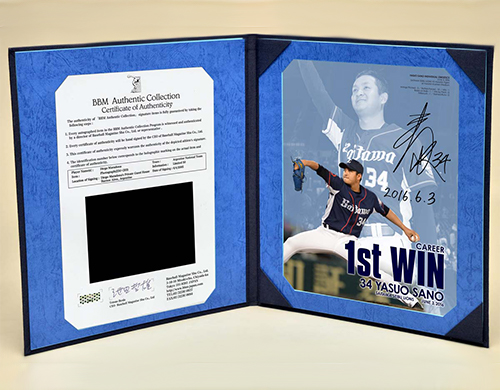 商品付属品のサイン保証書(サイン風景写真入り)には、限定数のシリアルナンバーが刻印され、ボール「34/50」・フォト「34/100」の商品は、背番号にちなんで、佐野投手本人に贈呈されます。プロ初勝利の喜びを選手本人と分かち合うことができる珠玉の逸品です。