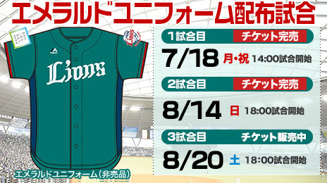 [2]「ライオンズ フェスティバルズ 2016」期間中(7/18〜8/21)の平日開催9試合で、「エメラルドユニフォーム(非売品)」付きチケットを、各試合500枚限定で販売いたします!