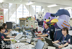 取り組みの開始に際し、球団マスコットのレオが、埼玉県庁を訪問。Saitamaユニフォームに身を包んだ、埼玉県のマスコット、コバトン・さいたまっちも合流し、各課を回りました。