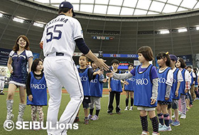 この日は親子で特別な思い出をつくってもらうために、「若獅子の走(ラン)」として試合前のベースランニング体験が親子15組30名さまに、そして試合開始直前の埼玉西武ライオンズの選手入場をサポートする「キッズ花道」が親子10組20名さまに当たる抽選会を開催!