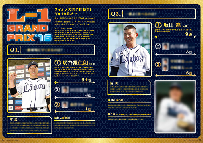 特集企画は「L-1グランプリ」。去年も人気のこの企画、今年も選手間投票を敢行しました! 今回は公式facebookとも連動し、ファンの皆さんからも質問を募集! 投票者も一軍メンバーだけでなくファームからも多数参加してくれました。各部門でトップに輝くのは誰だ!?