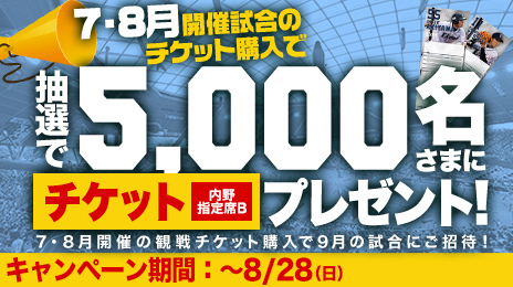 8月28日(日)までに、7・8月開催のライオンズ主催公式戦チケット(7/8~9/1の試合)を前売購入された方の中から抽選で『5,000名さま』を、激闘必至の終盤戦、9月の試合にご招待!