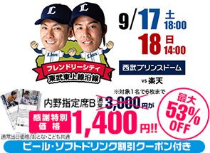 9月19日(月・祝)には、西武沿線の東京都に在住・在学・在勤の方すべてを対象に、観戦チケットが最大53%OFFになるお得な「西武沿線都民限定チケット」を販売。もちろん、ビール&ドリンクの割引クーポンが付いてきます。