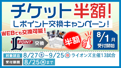 8月1日(月)~8月25日(木)の期間中、激闘必至のシーズン終盤(8/27~9/25)のライオンズ主催合計13試合を対象に、「チケット半額!Lポイント交換キャンペーン!」を実施します!