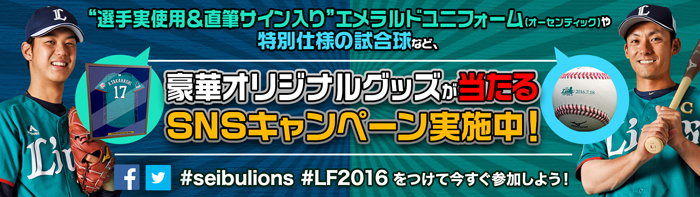 | 内容 | 7月16日(土)~8月21日(日)の期間中、公式Twitterアカウント(@lions_official)をフォロー、もしくは公式Facebookアカウント(seibulions.official)をご利用されている & 「ライオンズ フェスティバルズ 2016」の盛り上がりの様子をSNS上に投稿していただいた方の中から、抽選でライオンズオリジナルグッズをプレゼントいたします。 締切までの期間中、何回でもご投稿・ご参加いただけます。