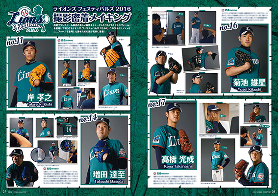特集企画は「ライオンズ フェスティバルズ 2016 撮影密着メイキング」。エメラルドユニフォームを着用して挑んだ12選手の写真撮影の舞台裏に潜入しています! それぞれの撮影秘話とともにお楽しみください!
