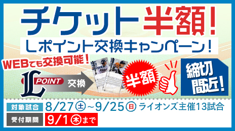 8月27日(土)~9月25日(日)のライオンズ主催 合計13試合を対象に実施中の「チケット半額!Lポイント交換キャンペーン!」ですが、好評のため、受付期間を9月1日(木)まで延長することが決定しました!
