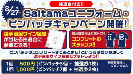 コンプリートまであと少し!という方、まだお目当ての選手のピンバッチを手に入れていない方はぜひこの機会に「抽選会付き!!Saitamaユニフォーム・ピンバッチキャンペーン」に参加して、おトクにピンバッチを手に入れよう!