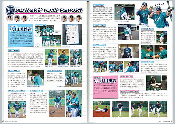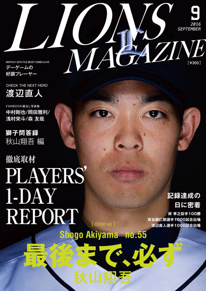 特集企画は選手の1日に密着した「PLAYERS 1-DAY REPORT」。今回は8月3連勝中と今後が楽しみな多和田真三郎投手、ベテランとしてチームを支える上本達之選手、打撃絶好調の山川穂高選手、そして今号の特集選手でもある秋山翔吾選手、さらにファームからはセットアッパー國場翼投手と左の大砲 戸川大輔選手の1日に密着! 取材4日後には國場投手がプロ初一軍昇格という嬉しい知らせも。