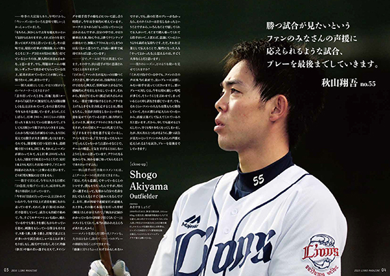 特集選手には現在安打数でリーグトップを争う安打製造機・秋山翔吾選手が登場! 苦しいチーム状況にも、「ファンの方が見たいのは勝利」と走攻守で全力プレーを続ける秋山選手。チームでただひとり、全試合フルイニング出場を続けながらもこれだけの成績を残し続ける秋山選手のプロとしての考え方に迫っています。