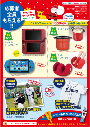 埼玉県を中心に全国で1,470店舗を展開しているドラッグストアのウエルシアグループで、ライオンズの選手が教えるウエルシア野球教室や、ライオンズの好きな選手の直筆サイン入りレプリカユニフォームなどが当たる「サンタのクリスマスキャンペーン」を実施中!