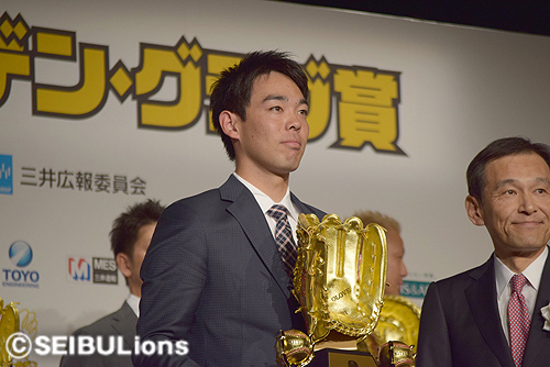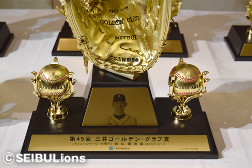 ライオンズから秋山 翔吾選手が出席、愛用のグラブをかたどって制作された金色のグラブ型トロフィーが授与されました。