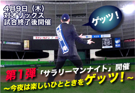 MY PAGE| 昨年の大好評企画、サラリーマンナイトがパワーアップして帰ってきました!今年もサラリーマンに活力を与えるイベントとして開催いたします。 第1回目は、スペシャルゲストとして元ライオンズ監督で名球会投手東尾修氏によるノックとブルペンピッチング実施します。 野球観戦のあとは、おもいっきり楽しいひとときをゲッツ! | ![]() |