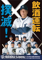 MY PAGE| 埼玉西武ライオンズでは、社会貢献活動の一環として、“飲酒運転撲滅!”を支援いたします。 この活動は、「悲惨を繰り返さないために・・・。」「飲酒運転を容認・助長等する行為も厳罰に!」を標語に、埼玉県内で飲酒運転による悲惨な交通事故を抑止するための対策を推進し、飲酒運転に対する意識を一層高めていただき、飲酒事故を防止する理解を深めていただくことを目的として実施されます。 これに伴い、埼玉県警察本部交通部では啓発活動の一環としてライオンズの監督・選手を起用した「飲酒運転撲滅!」ポスターを22,000枚制作し、埼玉県警察本部・埼玉県内各警察署・公共機関等に掲出いたします。 | ![]() |