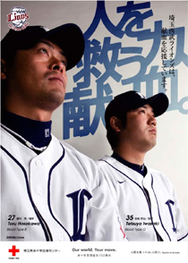 MY PAGE埼玉西武ライオンズでは、社会貢献活動の一環とした取り組みとしまして埼玉県民の皆様へ『献血意識の高揚・浸透』を促すべく、献血に対する理解を一層深めていただく年間活動として、“埼玉県赤十字血液センター”ポスターに埼玉西武ライオンズ細川亨選手と岩﨑哲也投手が支援いたします。