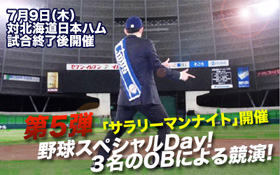 MY PAGE| サラリーマンナイト強化月間である第5弾サラリーマンナイトは、スペシャル野球Dayとして実施します。 今年実施した様々なサラリーマンイベントを盛りだくさんに、3人のOBによる充実した野球スペシャルサラリーマンナイトを行います。 以前ブルペンピッチやスチールに参加できなかったという方は、ぜひこの機会にお楽しみください! | ![]() |