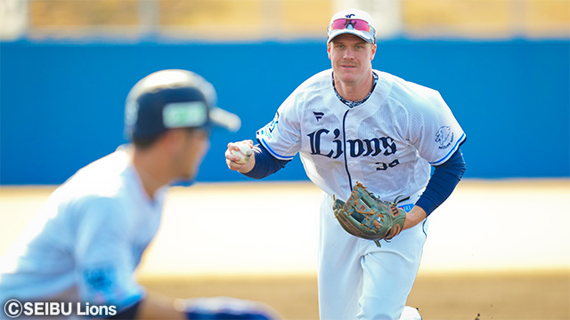 ランチブレイク後は、野手陣は打廻りを行ったあとに個別練習を行いました。サブグラウンドでは、外崎選手と陽川選手が特守を実施。疲れがある中でも大きな声を出して、守備力強化に励んでいました。