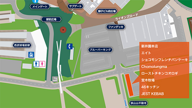 「KING OF 獅子まんま 2023」で総合グランプリに選ばれた「ライオンズ焼き」に加え、小腹を満たすにはピッタリの軽食からデザートまでバラエティに富んだ8店舗が営業予定です。