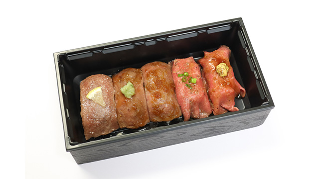 ファンの皆さまに、よりご満足いただける商品とすべく、価格据え置きのまま、4貫だった肉寿司を5貫に増量いたします。黒毛和牛のお寿司が3貫(岩塩+レモン、カルビだれ+わさび、おろし玉ねぎだれ)とローストビーフ寿司が2貫(塩だれ+小ねぎ、醤油だれ+粒マスタード)とご本人納得の組み合わせです。