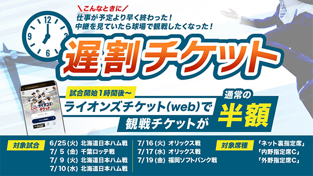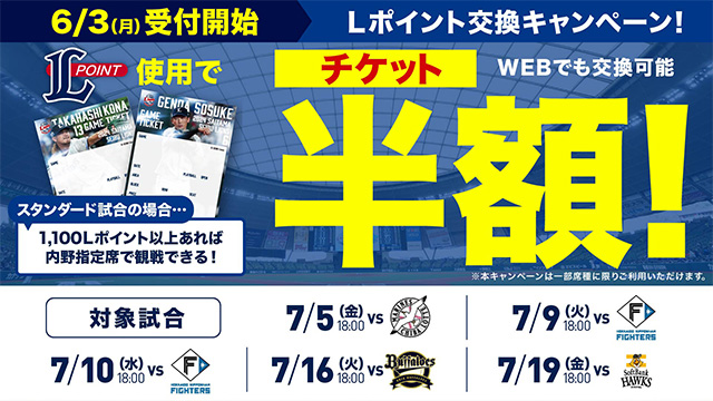 Lポイントでの決済は、全販売窓口において一般販売開始日9:00~(ベルーナドームチケットセンター・ライオンズストアでは各店舗の営業開始時間~)となります。