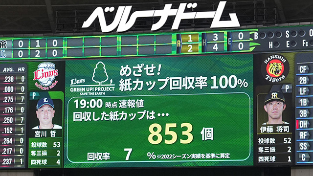 ベルーナドーム内で分別回収された紙カップは、トイレットペーパーにリサイクルされる貴重な資源の1つ。2022シーズンはわずか3割だった回収率が、皆さまのご協力のおかげで2023シーズンは7割に到達!あなたの持つ紙カップ1つが、行動を起こすきっかけに!チームの勝利と共に、紙カップ回収率100%を目指しましょう!